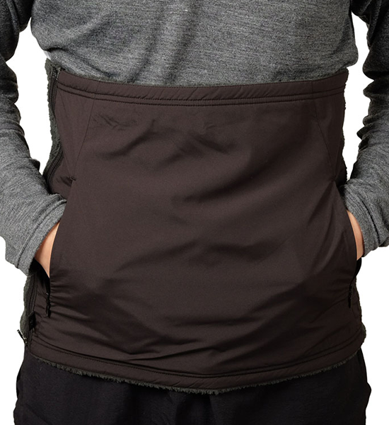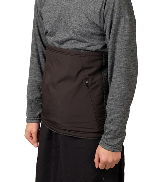 POLARTEC HIGH LOFT の毛足の長いフリースによってクイックハラマキ史上最高の暖かさとふわふわで軽い着心地を提 供します。腹部には適度に風を防ぎながら汗を排出する帝人の MINOTECH マットタフタを宛てているので、冬のシノギ ングで寒さを凌ぎつつ汗を凌ぐミニマルなアクティブインサレーションとして活躍します。
