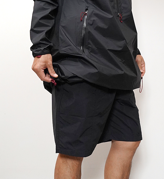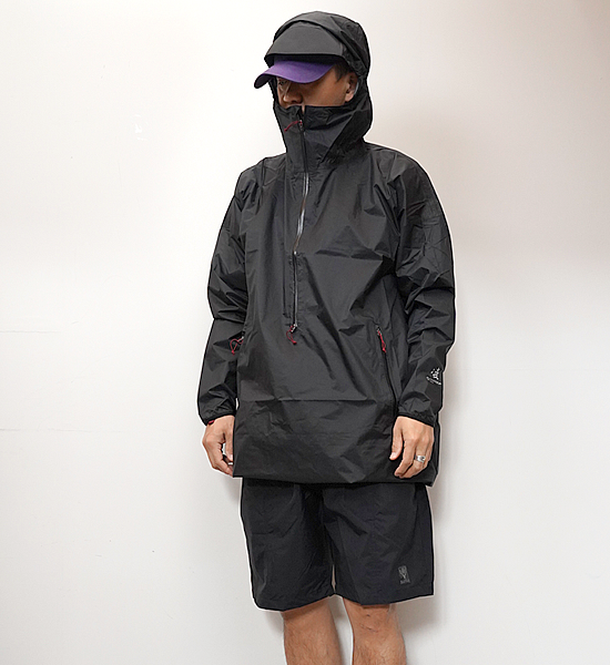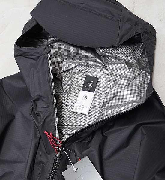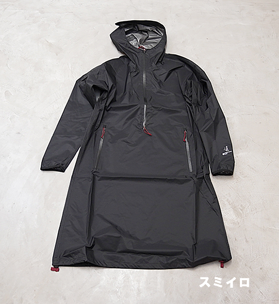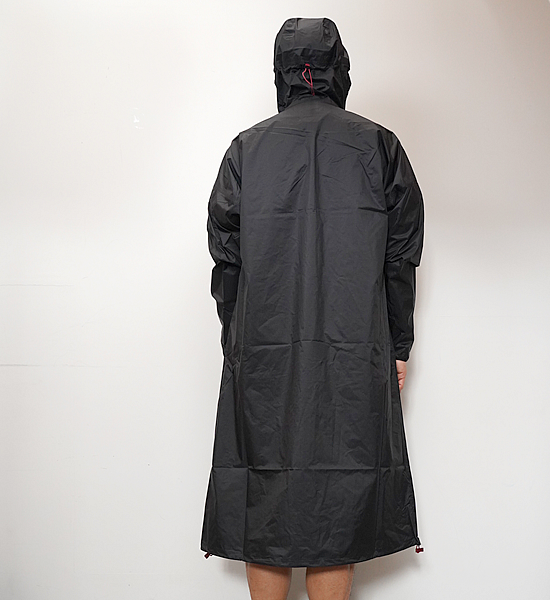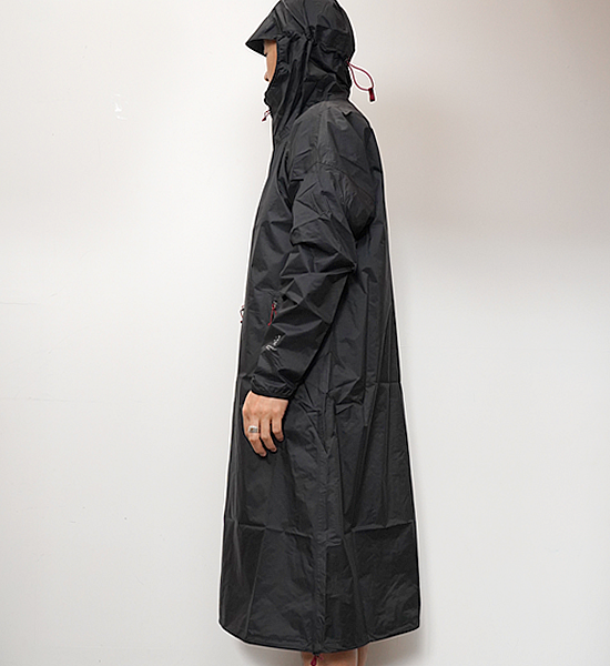 着丈が長く頭から膝まで覆うので容易には雨に濡れない安心感があります。防水透湿素材を使用していますが、気温や運動の程度によっては汗の放出が追い付かずに蒸れを感じたり内側が結露したりすることがあります。上下から開くフロントファスナーを下から開ければベンチレーションとして機能する他、フード周りを開くことなくインナーのシャツやヤマバッグなどにアクセスできます。また、長いフロントファスナーはパンツのように穿いたり脱いだりできるので便利です。腰の左右に配置されたジッパー(スルーポケット)はパンツのポケットにアクセスできるだけでなくベンチレーションとしても機能し、バックパックのヒップベルトを内側に通して止めることができるのでベンチレーションを妨げることもありません。