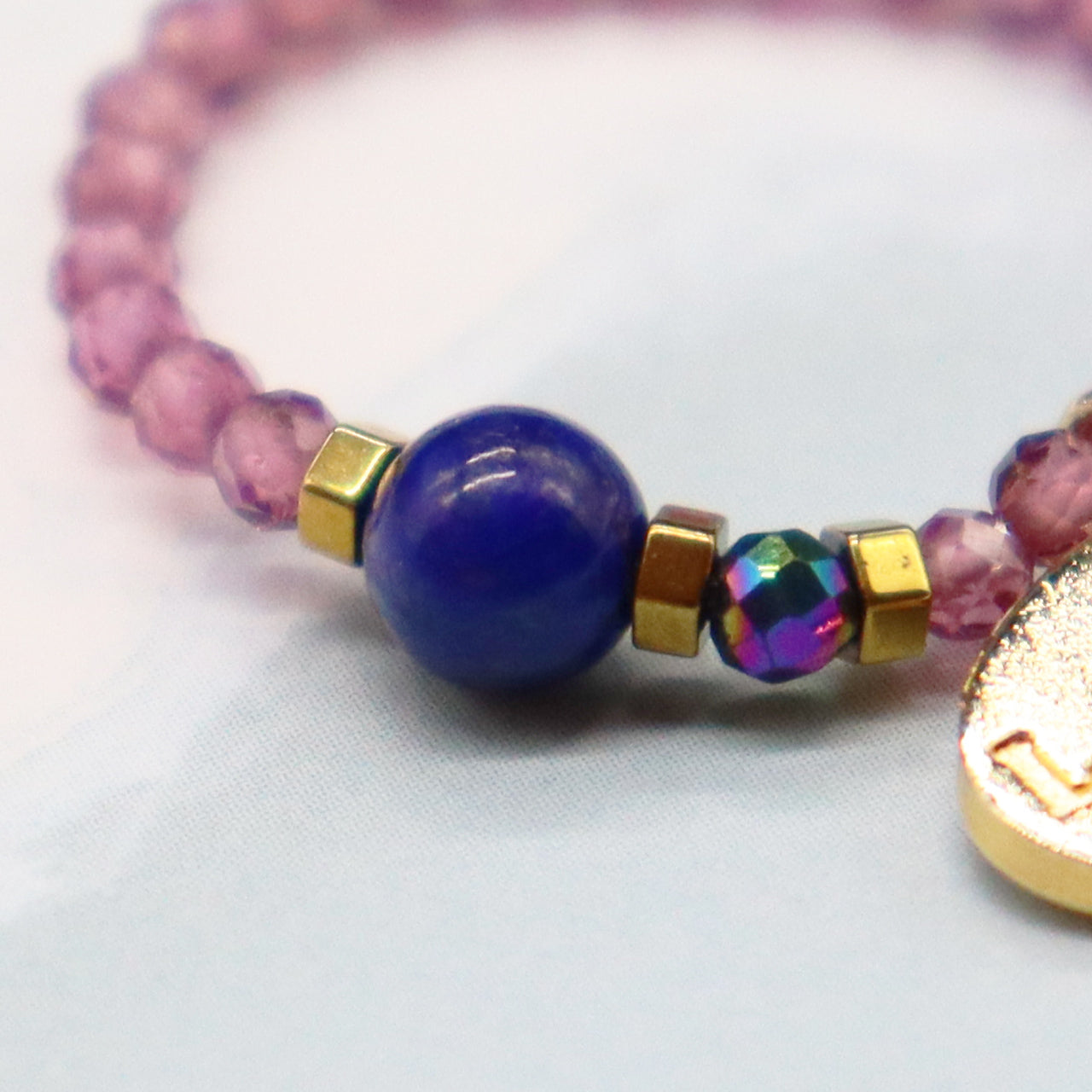 9月誕生石。深く鮮やかな群青に、金色が星の様に散りばめられた「ラピスラズリ」は、夜空を思わせる神秘的な宝石です。幸運を呼ぶ石として古くから知られ、世界で最も古いパワーストーンのひとつとされています。その深い青は「夜空」を、煌めく金色を「星」を象徴し、まるで天空を閉じ込めたような美しさから、「天空を象徴する聖なる石」と呼ばれ、人々を魅了してきました。古代エジプトでは黄金に匹敵するほどの価値を持ち、最高の力を秘めた護符として王族の装飾品としても用いられていました。ラピスラズリは、持つ人の潜在的な問題を顕在化させ、それを解決へ導くことで、本質的な幸福をもたらすと言われています。また、人生において自分が進むべき道を気づかせ、カリスマ性を高める力を宿す石として今なお多くの人に愛されています。