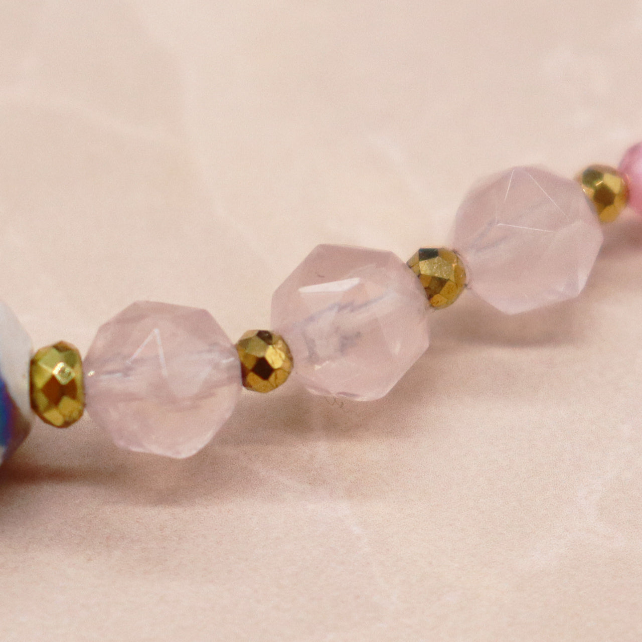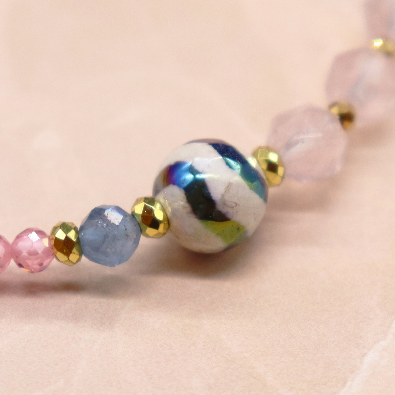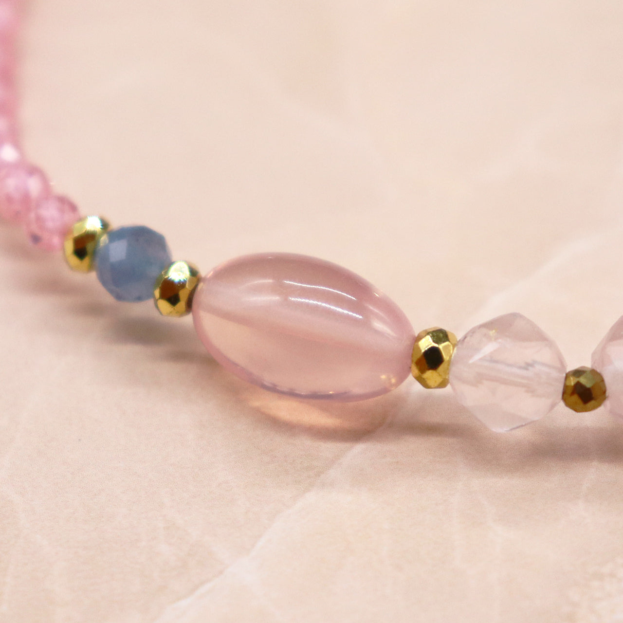 【Blooming Pink Roses】水紋天珠×ローズクォーツ×ジルコニア×アクアマリン ブレスレット